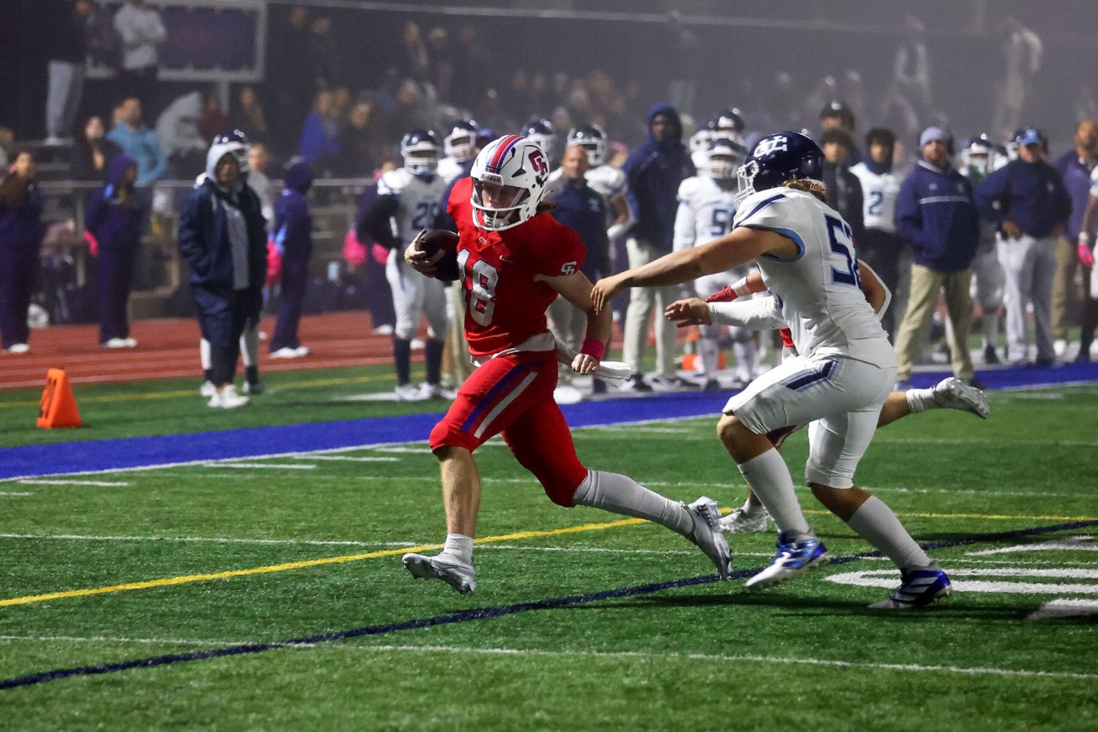 Senior quarterback Mac McAndrews suited up after missing last week’s game with a shoulder injury, but sophomore Soren Hummel started for a second consecutive week, throwing for 215 yards and a pair of touchdowns. He hit Pierce St. Geme for a 7-yard touchdown late in the first quarter and found Moe Barnum for a 3-yard score with six seconds left in the first half, capping off a 70-yard drive and extending the lead to 14-0 going into the break.