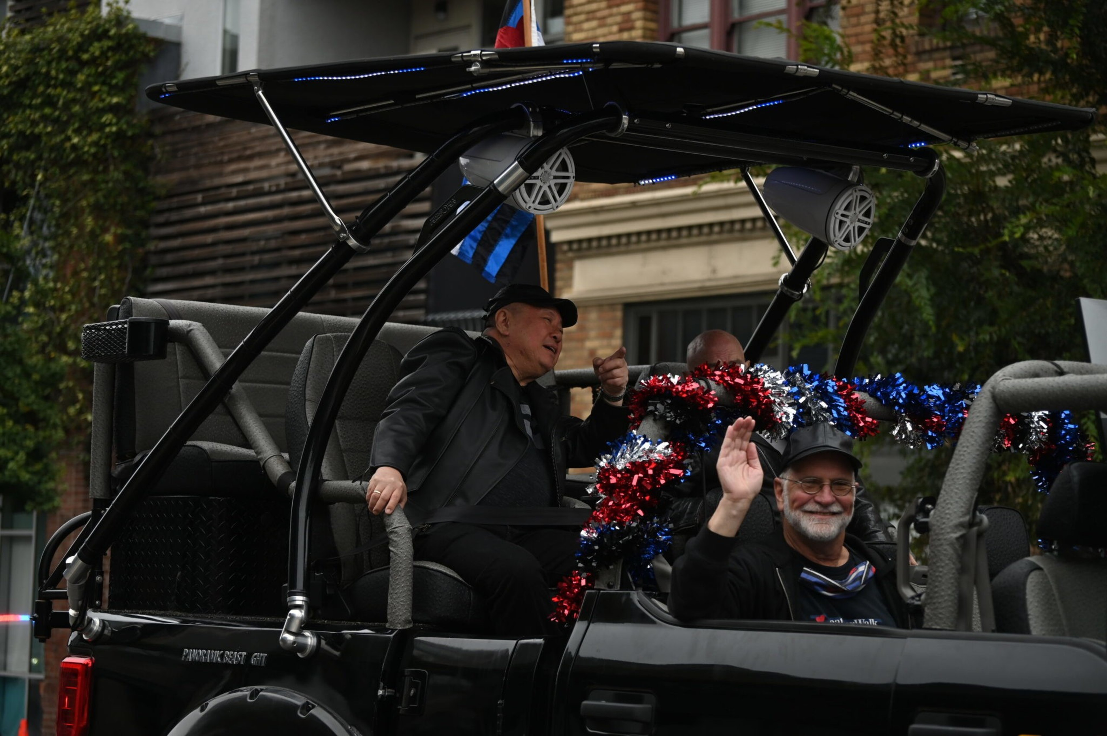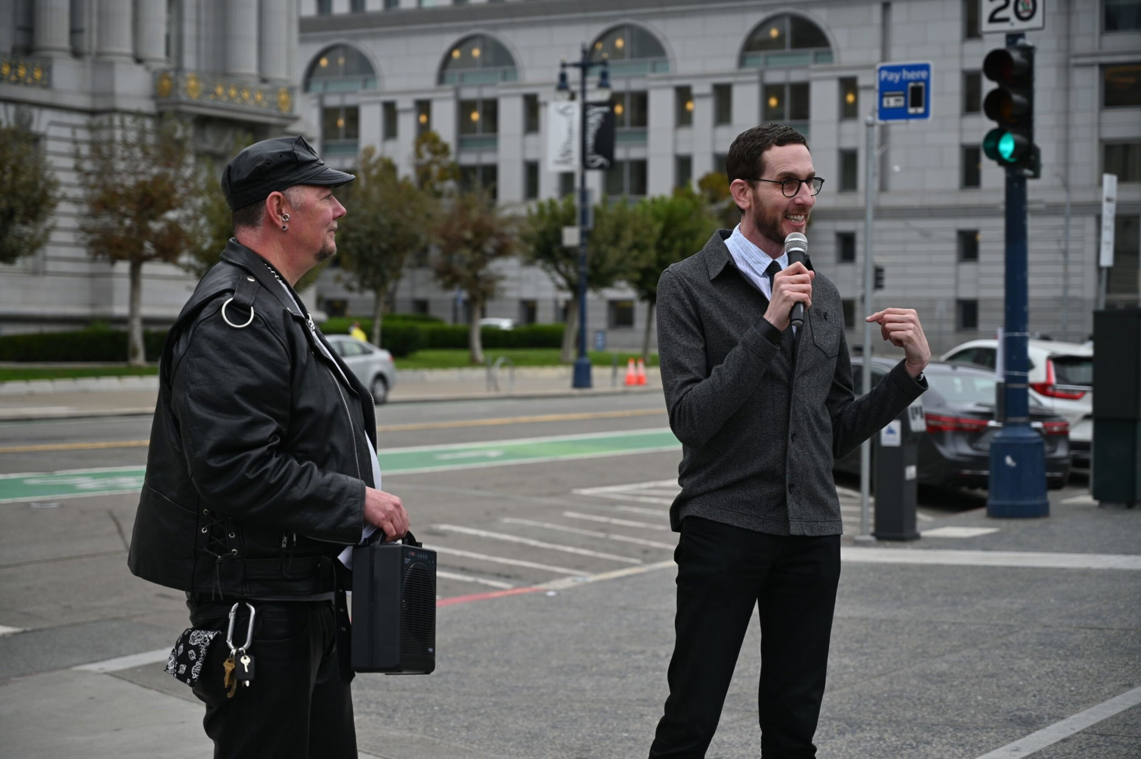 State Sen. Scott Wiener speaks in front of City Hall for Leather Walk in San Francisco on Saturday, Oct. 15, 2022. | Samantha Laurey for The Standard | Source: Samantha Laurey for The Standard