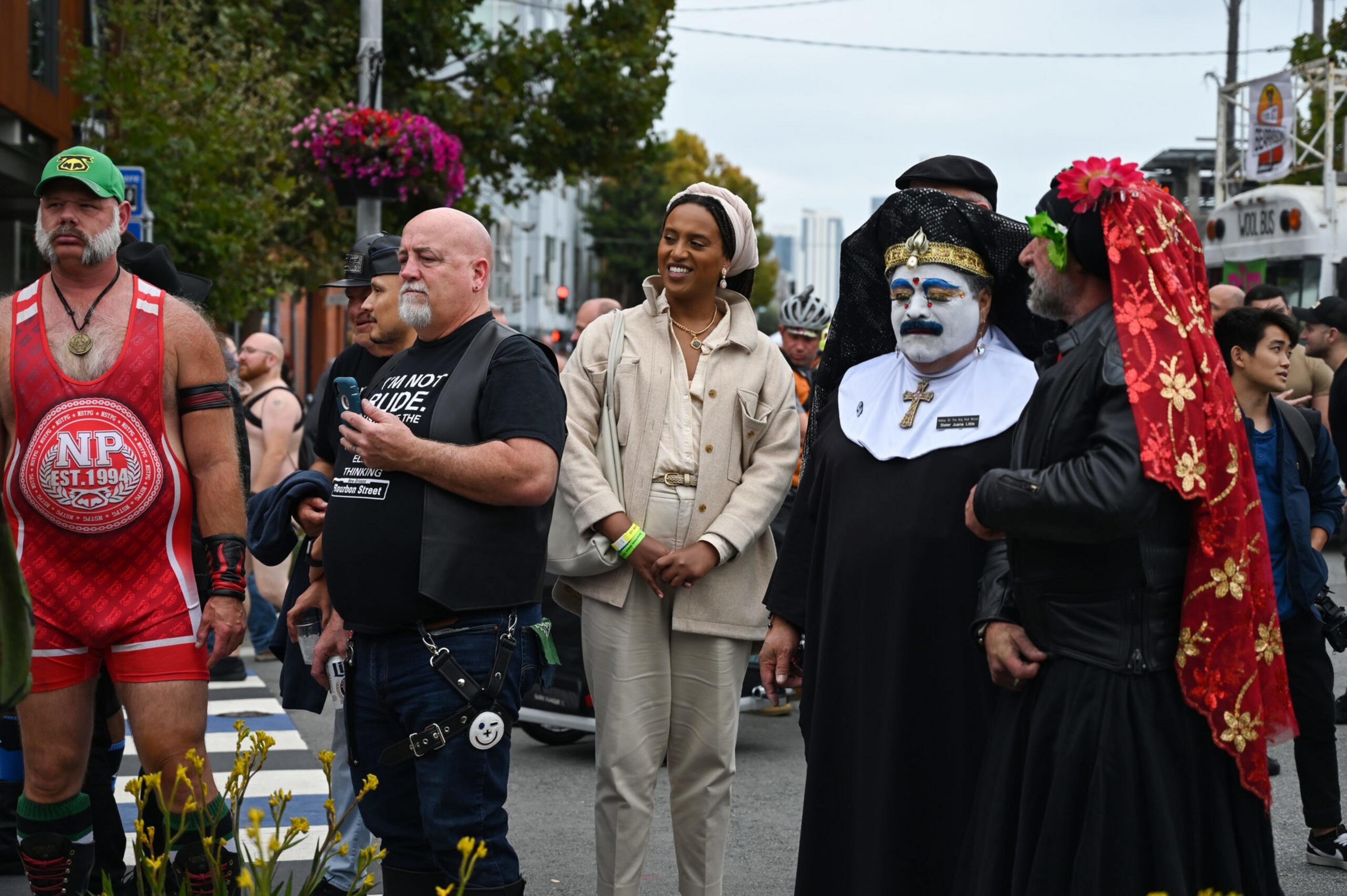 Attendees head towards SF Eagle for the flag raising at Bearrison Street Fair for Leather Walk in San Francisco on Saturday, Oct. 15, 2022. | Samantha Laurey for The Standard | Source: Samantha Laurey for The Standard