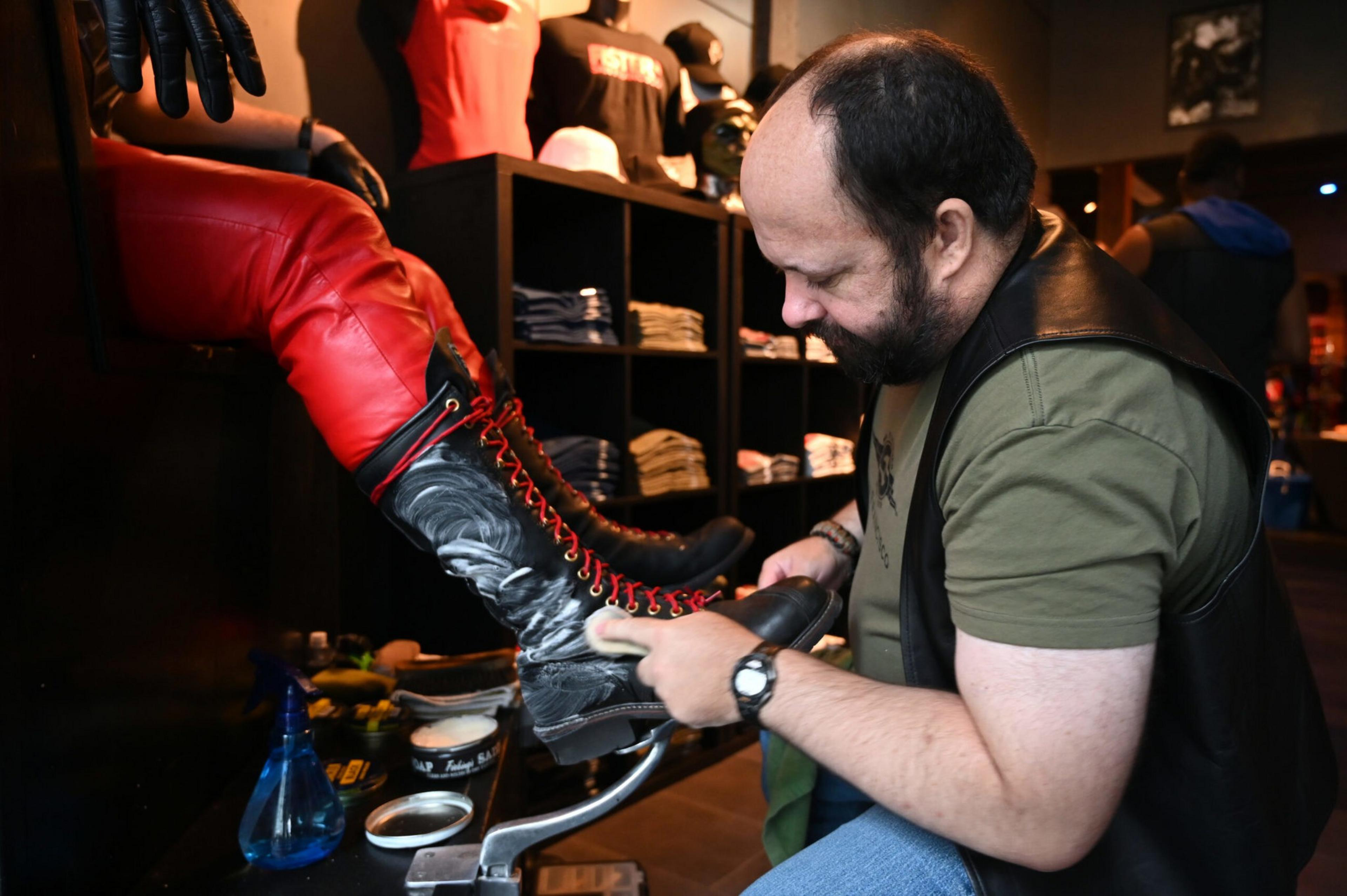 Mr. Blu shines Jeffrey Wayne’s boots at Mr. S Leather Co. during Leather Walk in San Francisco on Saturday, Oct. 15, 2022. | Samantha Laurey for The Standard | Source: Samantha Laurey for The Standard