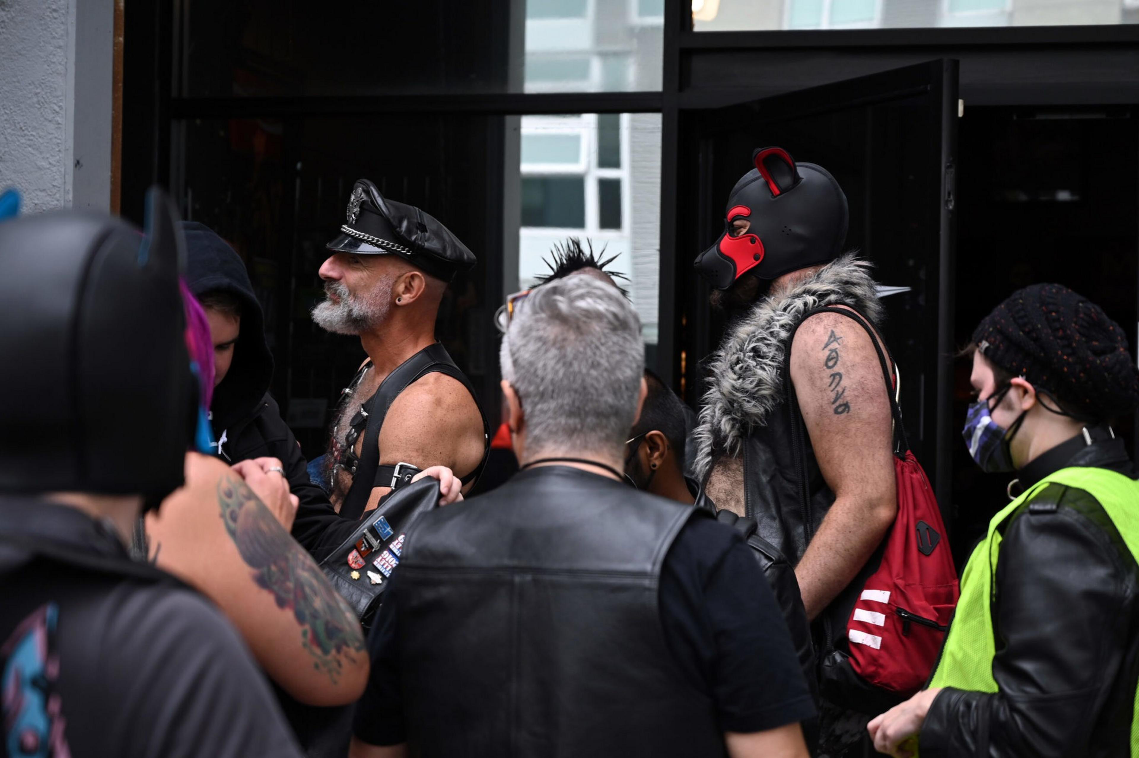 Attendees walk to Powerhouse for Leather Walk in San Francisco on Saturday, Oct. 15, 2022. Attendees stop for a drink, a bathroom break or to take pictures around the bar. | Samantha Laurey for The Standard | Source: Samantha Laurey for The Standard