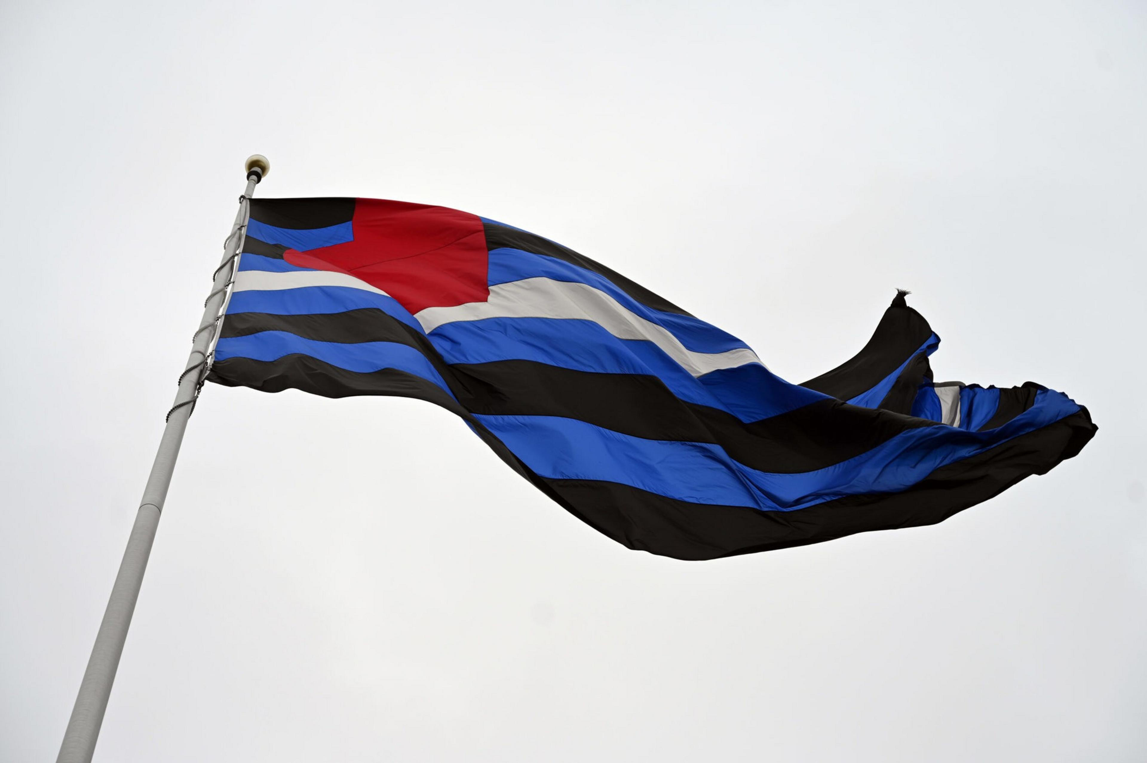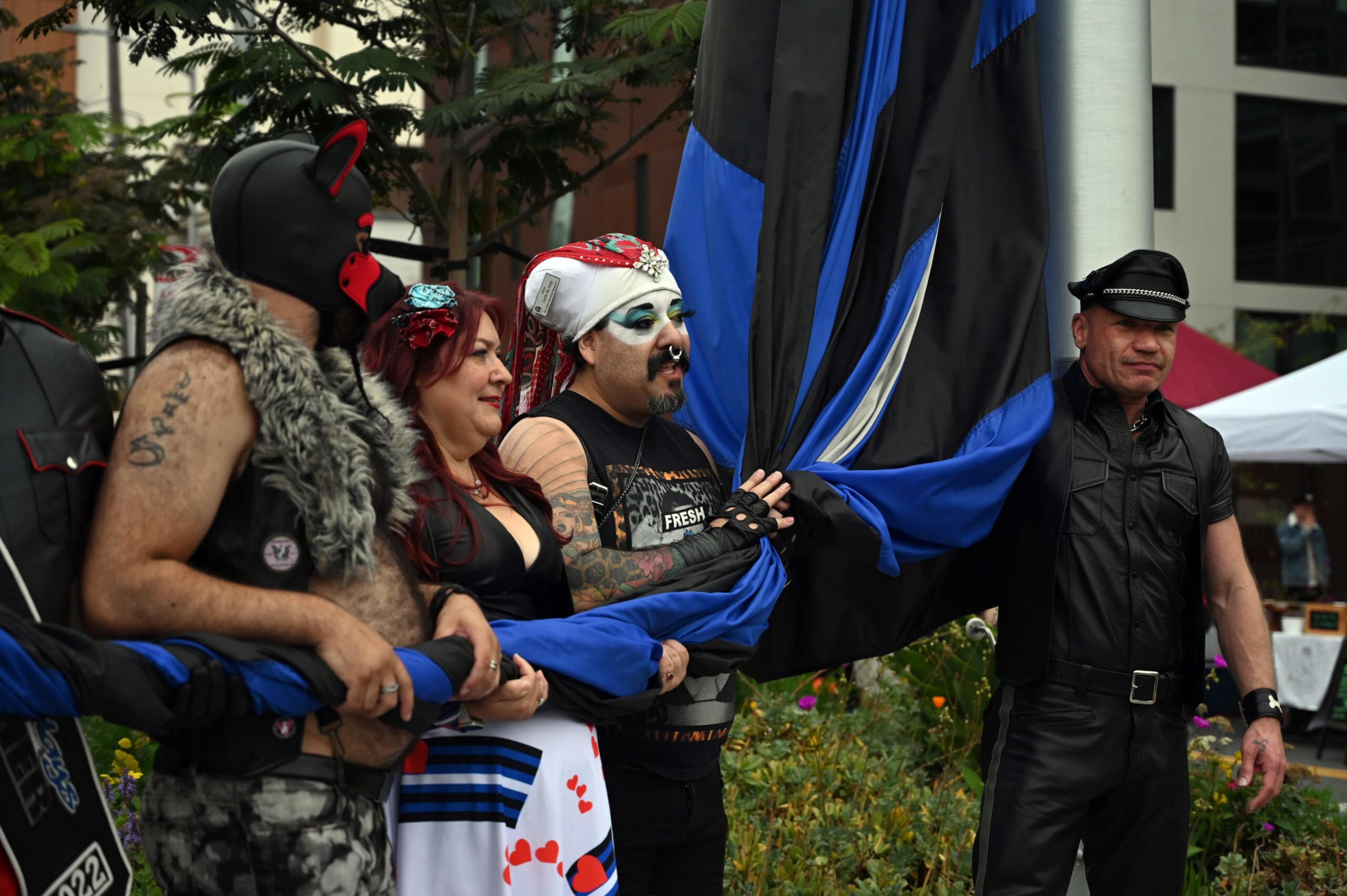 Attendees come together at SF Eagle for the flag raising at Bearrison Street Fair in San Francisco on Saturday, Oct. 15, 2022. | Samantha Laurey for The Standard | Source: Samantha Laurey for The Standard