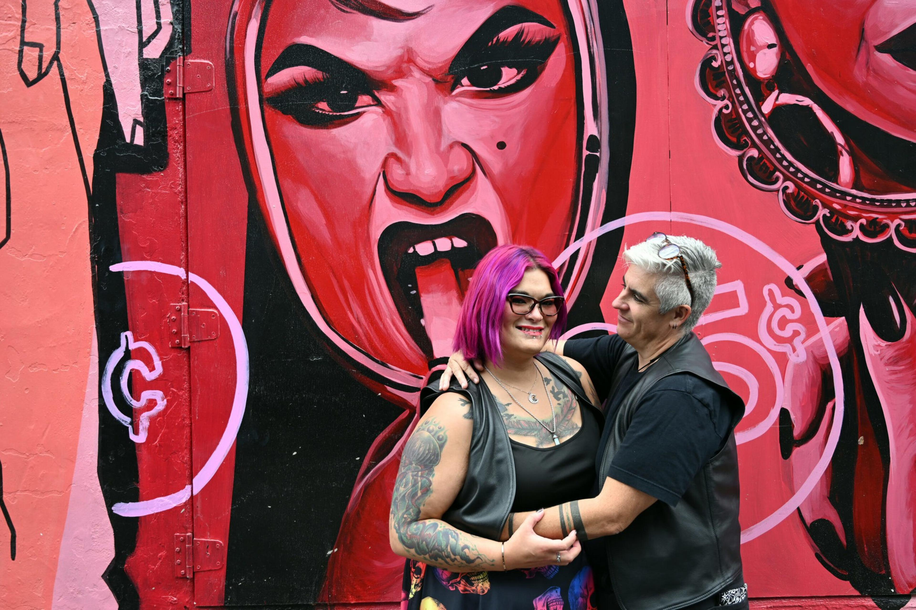 From left, Reika Faust, Ms. SF Leather 2019, and Mo Prichard, doorkeeper of The Exiles, take a break at Oasis for Leather Walk in San Francisco on Saturday, Oct. 15, 2022. Attendees stop for a drink, a bathroom break or to take pictures around the bar. | Samantha Laurey for The Standard | Source: Samantha Laurey for The Standard