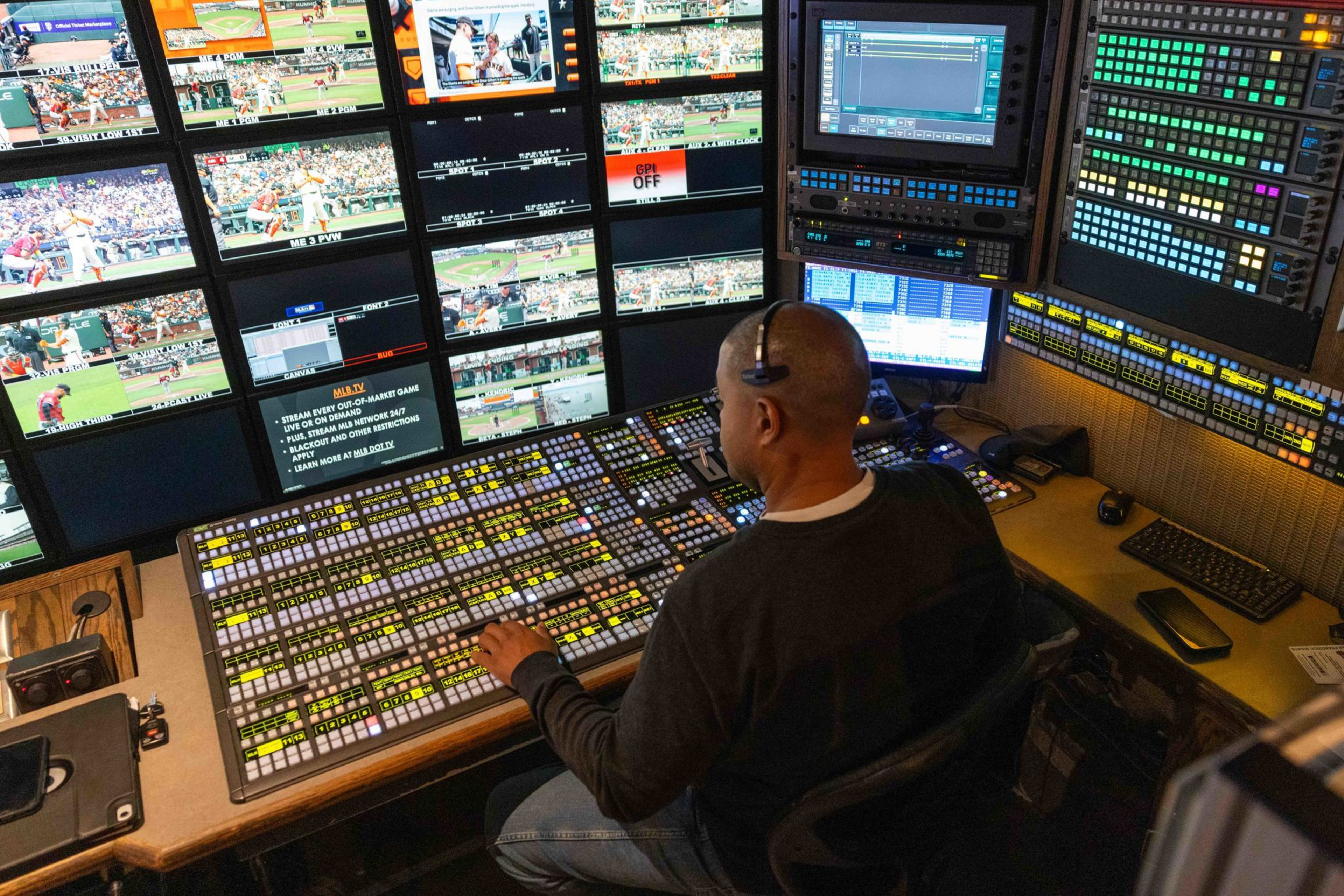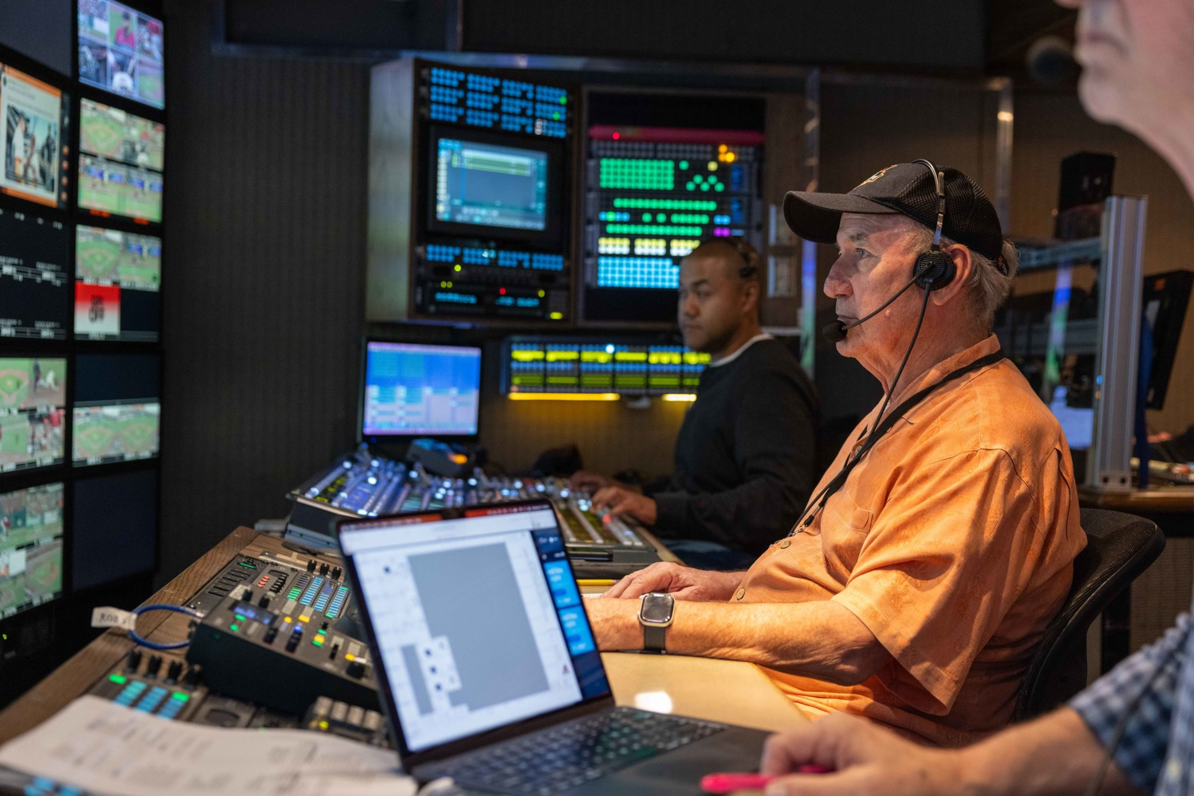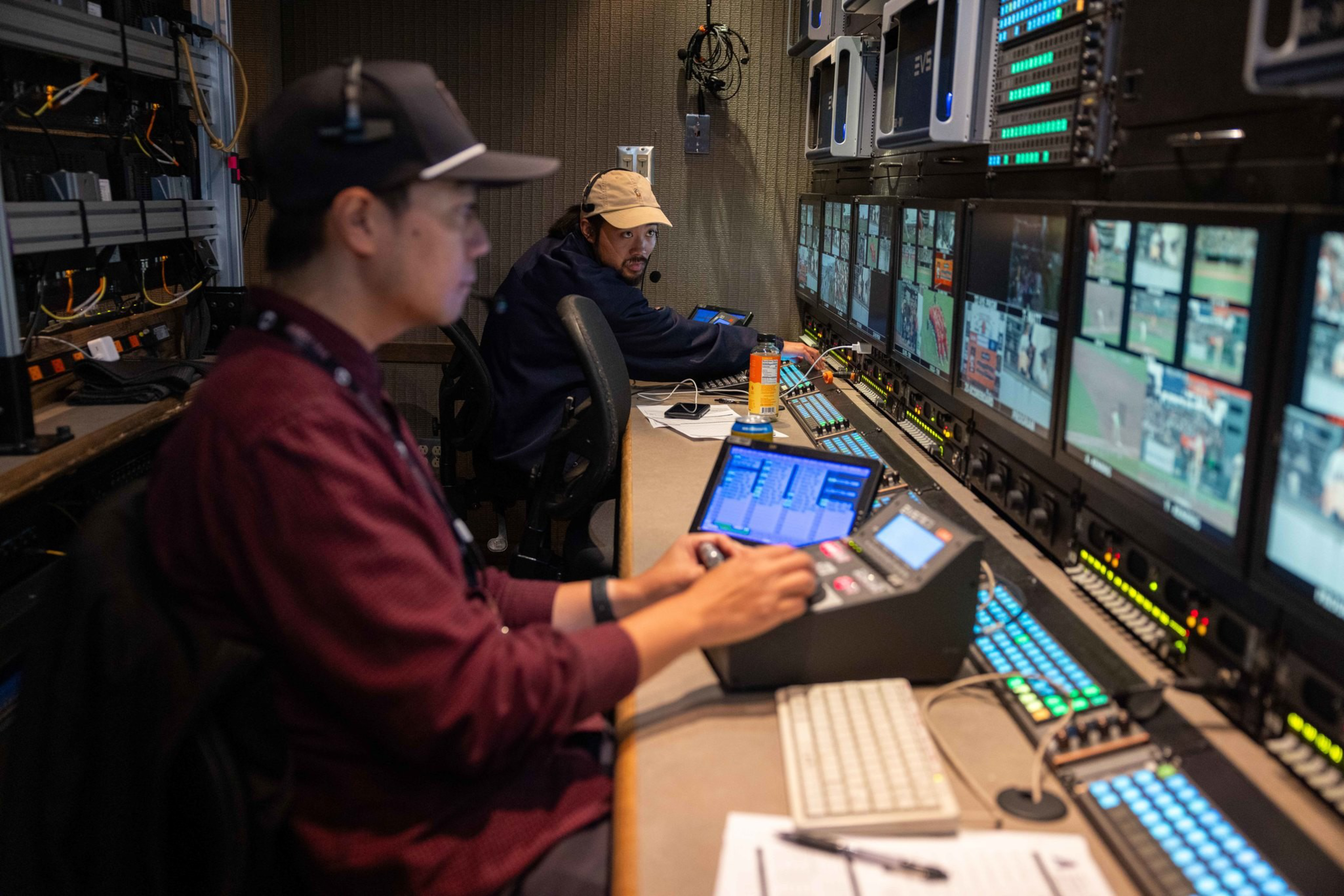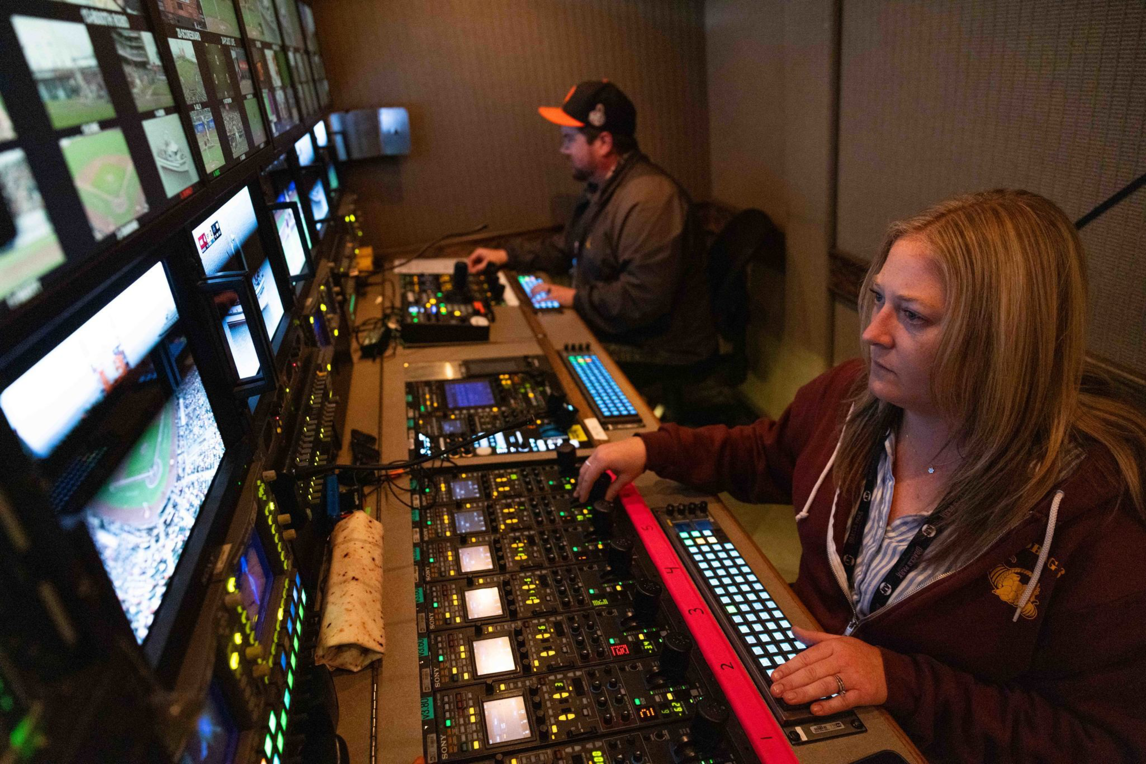 Inside a massive, high-tech broadcast truck under the left-field bleachers, adjacent to the player parking lot, with too many monitors and gadgets to count, a long-running production staff amps it up.