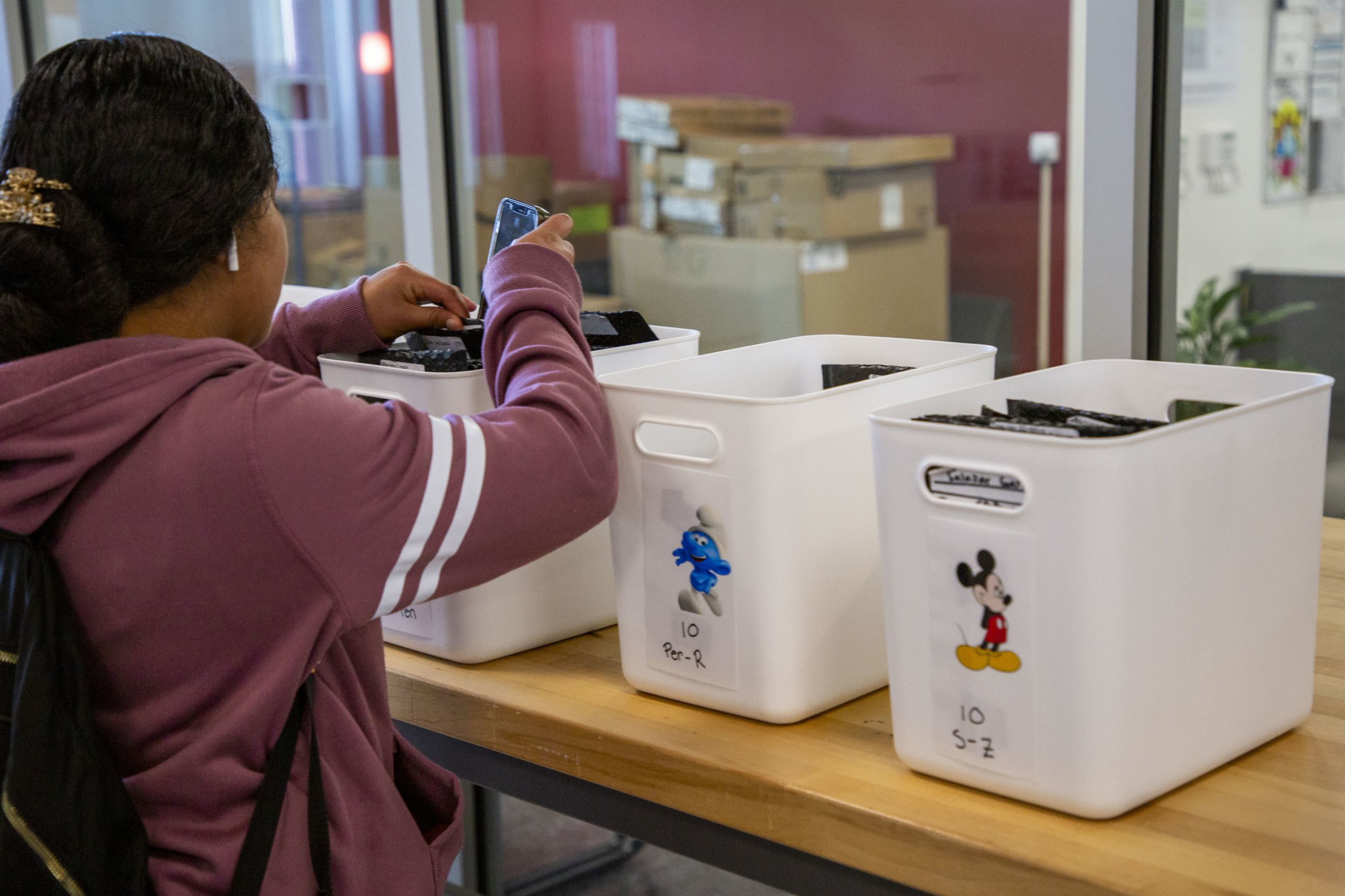 At Marshall, 13 bins greet students in the foyer. As the teenagers trickle in each morning, they fist-bump friends, say hi to teachers, and drop their phones into assigned bubble-wrapped envelopes inside the bins, labeled with names. As the day unfolds, there is not a phone in sight. Not in class. Not in the bathroom. Not in the hallways.