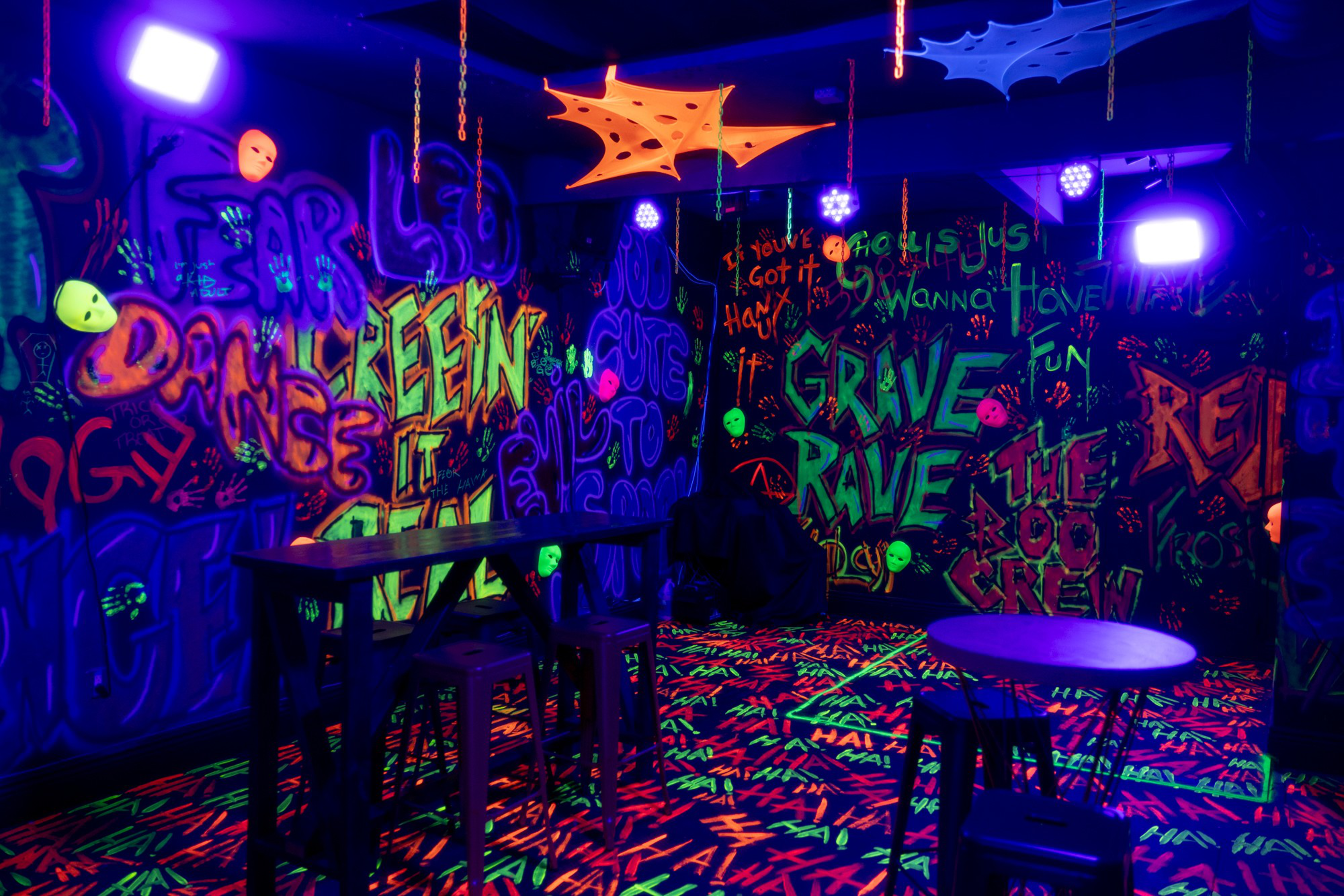 While some bars go for jump scares, this pop-up is all about black light. Two doors down from Moe’z Tavern is Ghostlight, a side project that looks like an insane asylum threw an after-party. The floor and walls are covered in day-glo messages reading “HA!,” and the bartenders pour concoctions like the Eternal Midnight (Smirnoff vodka, Mr. Black coffee liqueur, cacao nib, amber honey, and pumpkin spice) and the Bay of Shadows (Casamigos blanco, agave, habanero tincture, and lime). Frightening? Not so much. Weird as hell? You bet.