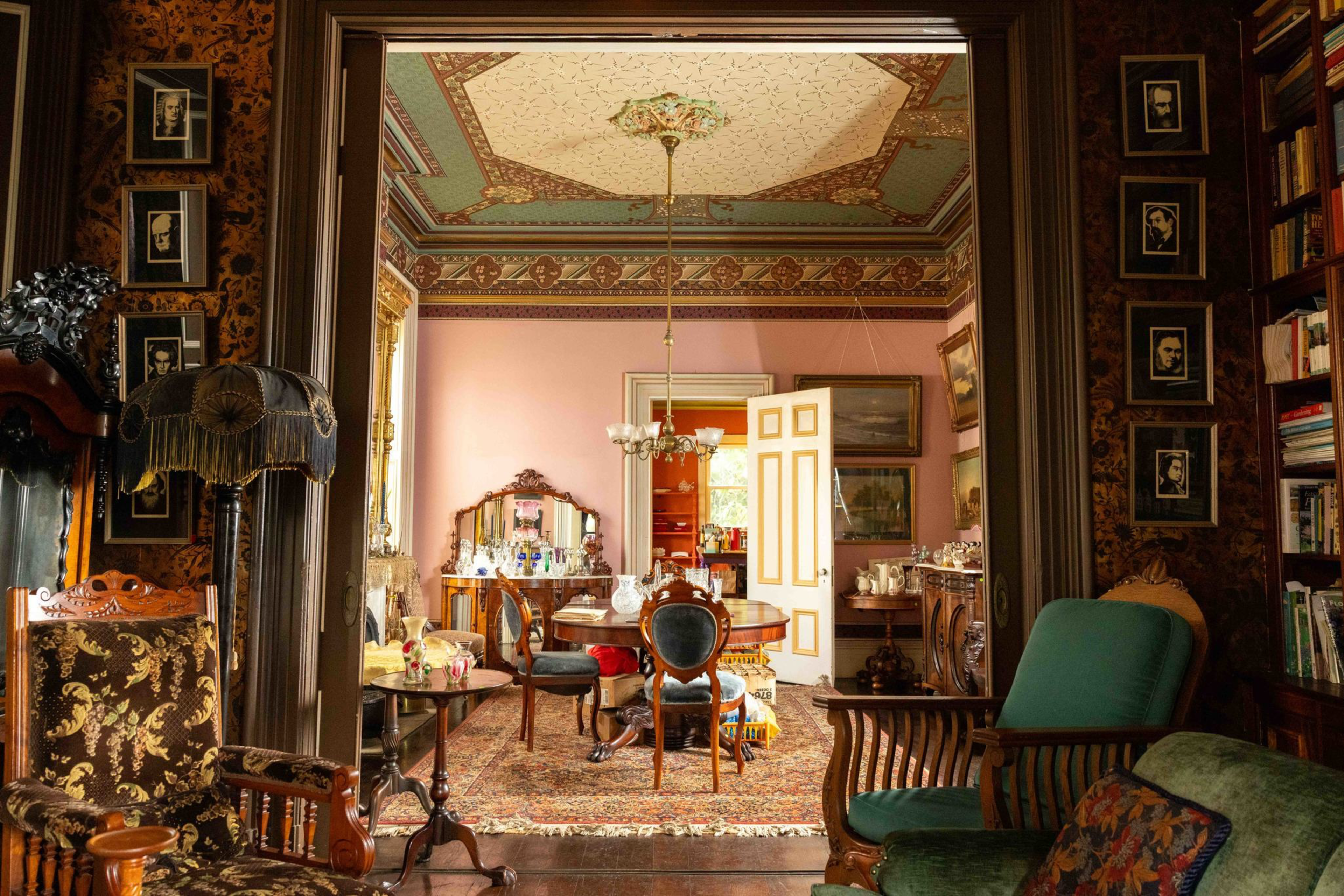 The results are stunning: Bradbury & Bradbury wallpaper in a custom colorway created just for the house, with stenciling by famed cycling artist Larry Boyce (opens in new tab); six original and fully operational marble fireplaces relined for wood burning; a 1915 original art nouveau mural by the son of the second owner, Silvio Faggione; and a working 1870s Crawford cast iron stove.