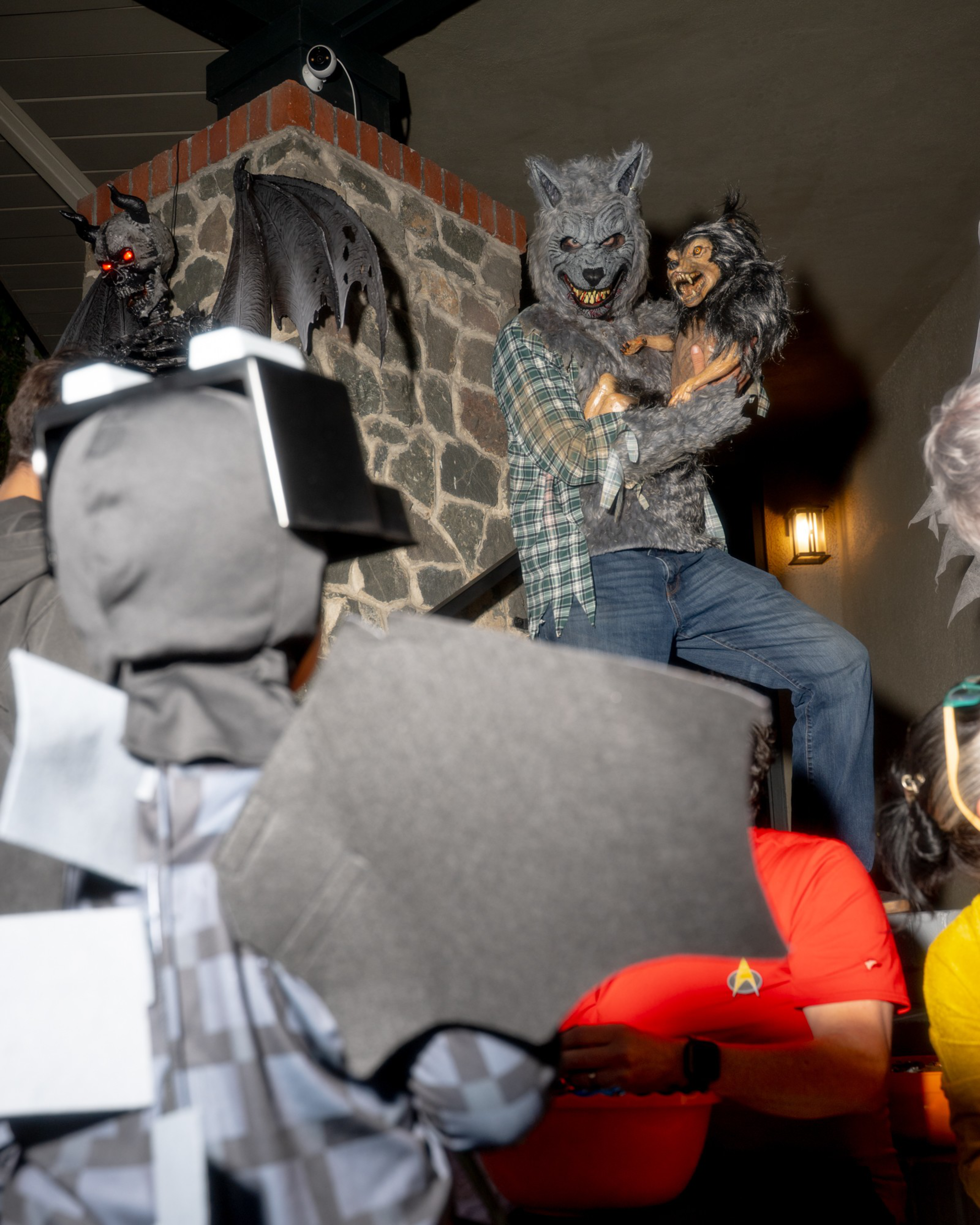 This year’s decorations include a freestanding door and a giant Yahtzee box, along with a collection of undead dolls (some impaled on stakes). The theme is “haunted toy store.”