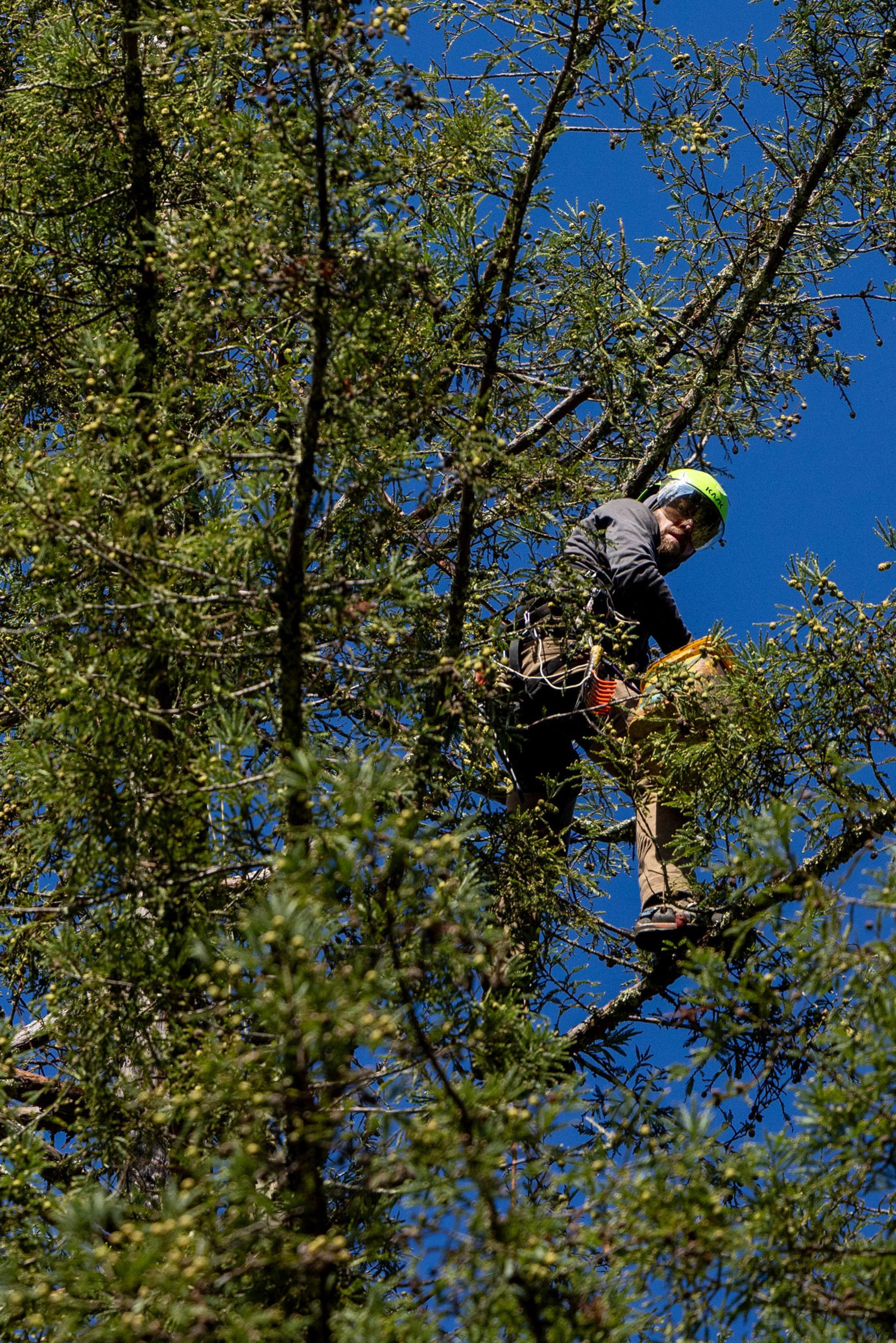 After reaching the top of a sugar pine earlier this year, Ryan’s ground crew told him the work was done — the team had collected enough cones. Instead of coming down, he roped in at a fork near the top, rested his head against one branch, and threw his legs over another.